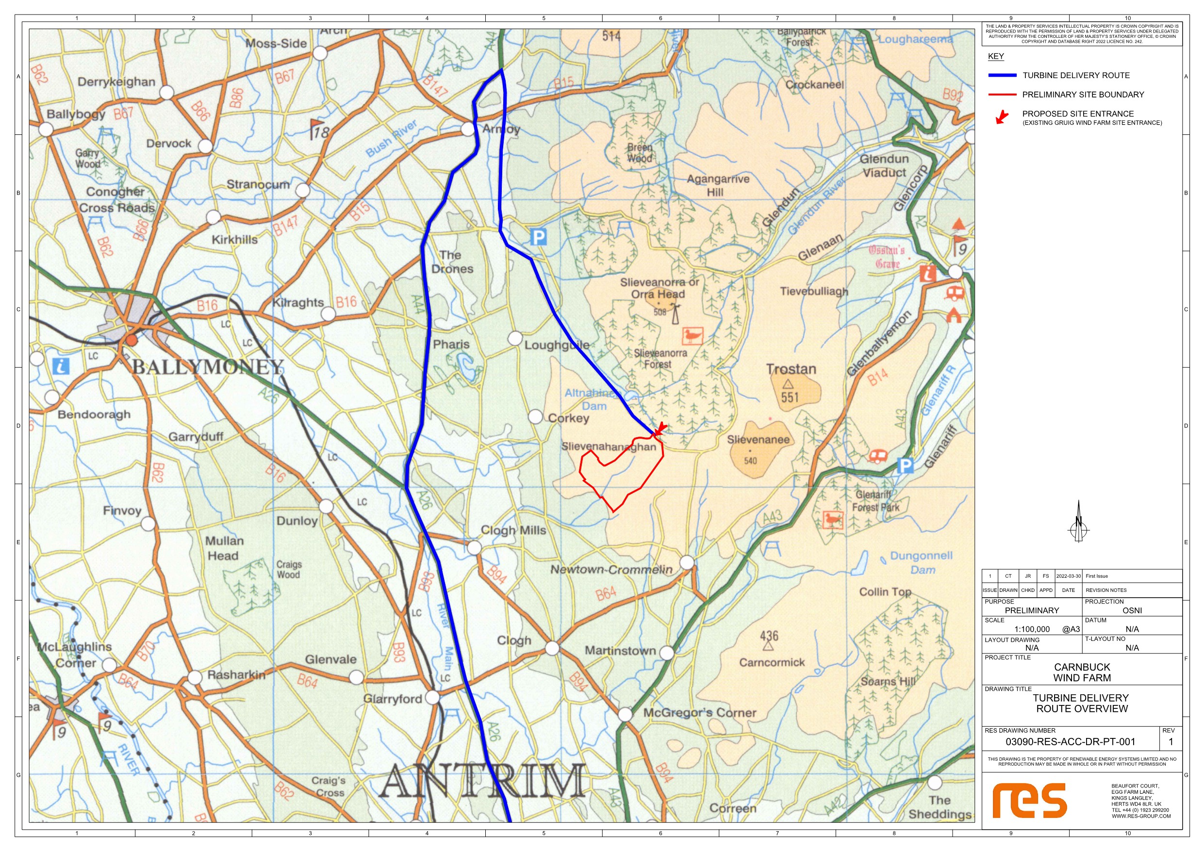 Located in the townlands of Carnbuck, Magheraboy and Moneyneagh, near Corkey, Co. Antrim, adjacent to the existing Gruig Wind Farm.