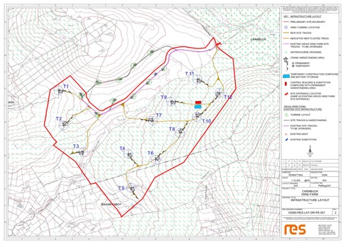 The plan to the right shows the preliminary layout of the proposed twelve turbines at Carnbuck Wind Farm, which have a maximum tip height of 180m.