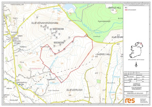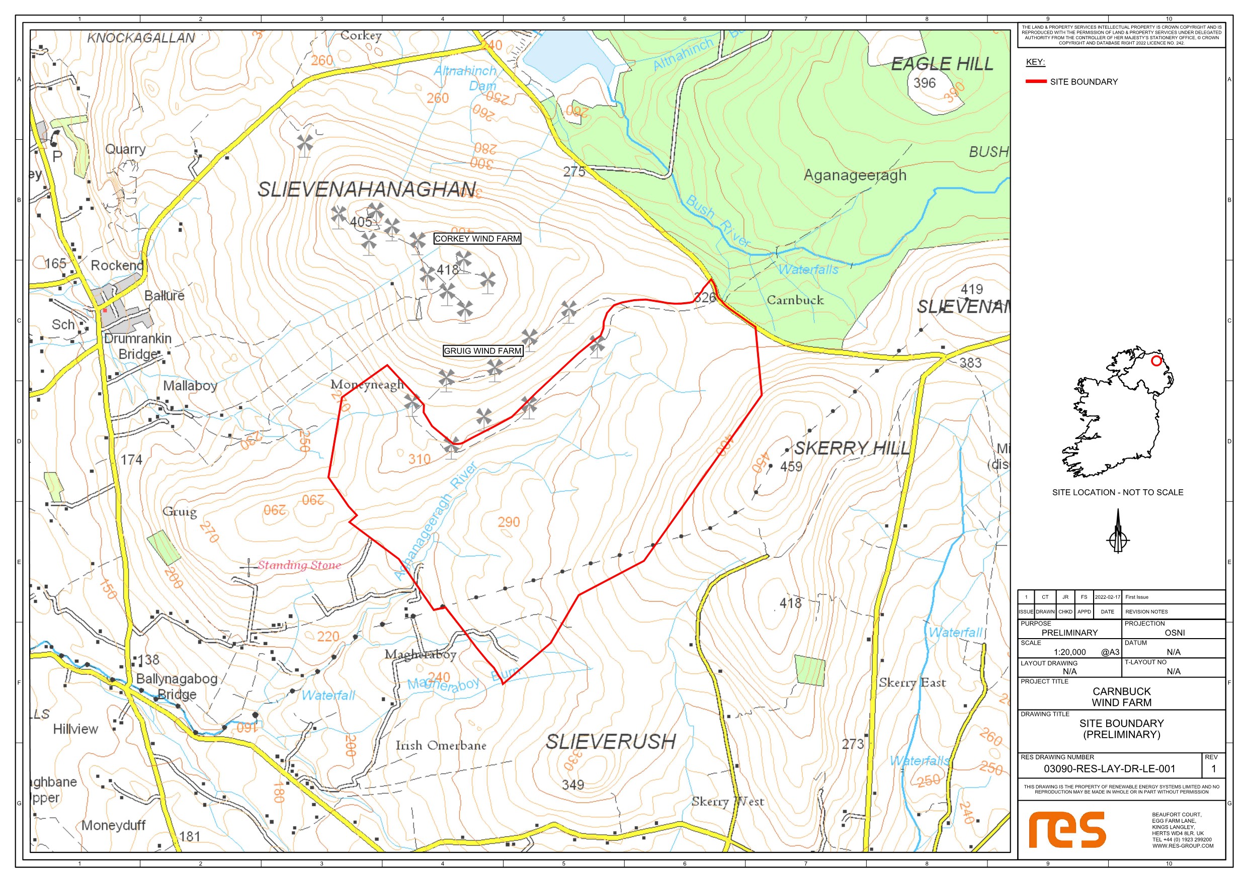 Located in the townlands of Carnbuck, Magheraboy and Moneyneagh, near Corkey, Co. Antrim, adjacent to the existing Gruig Wind Farm.